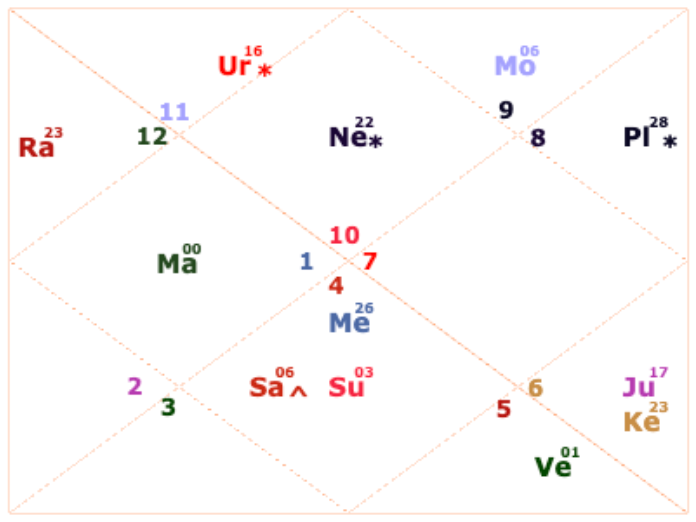 - Sandhi (Cusp): 29°-1°, indicating transitional energy—often confusion or indecisiveness in the planet’s expression.